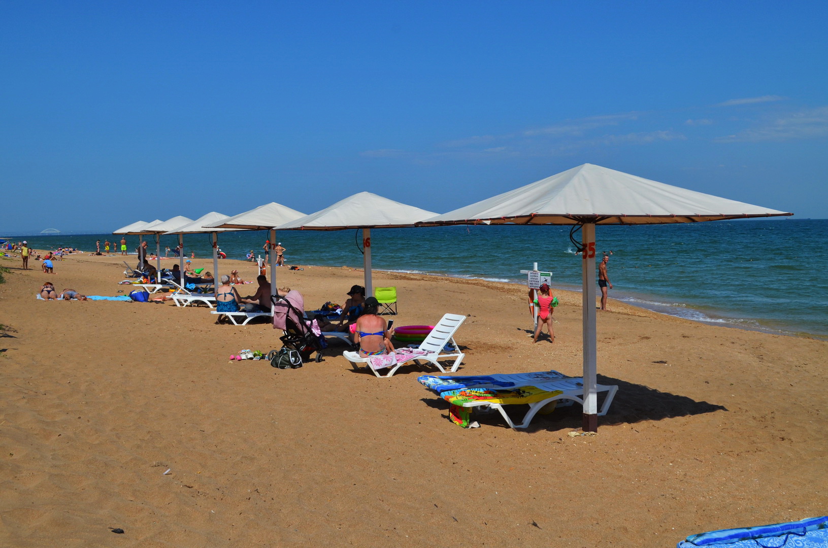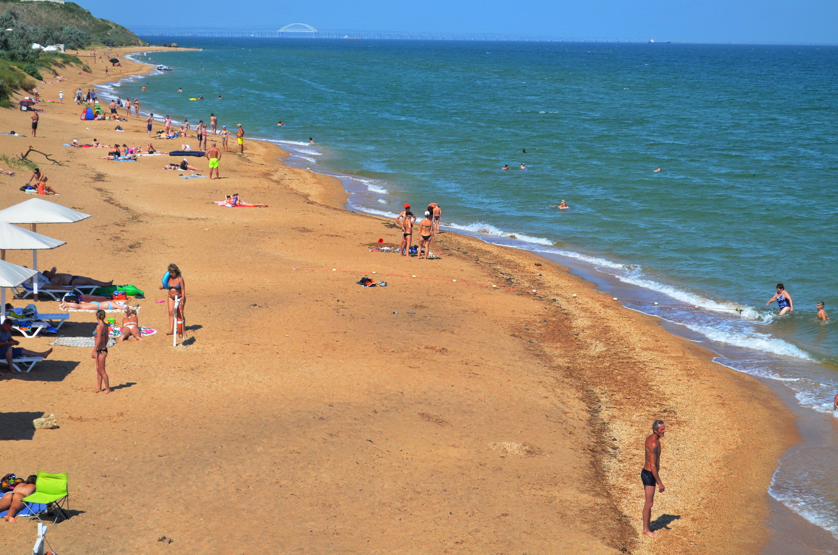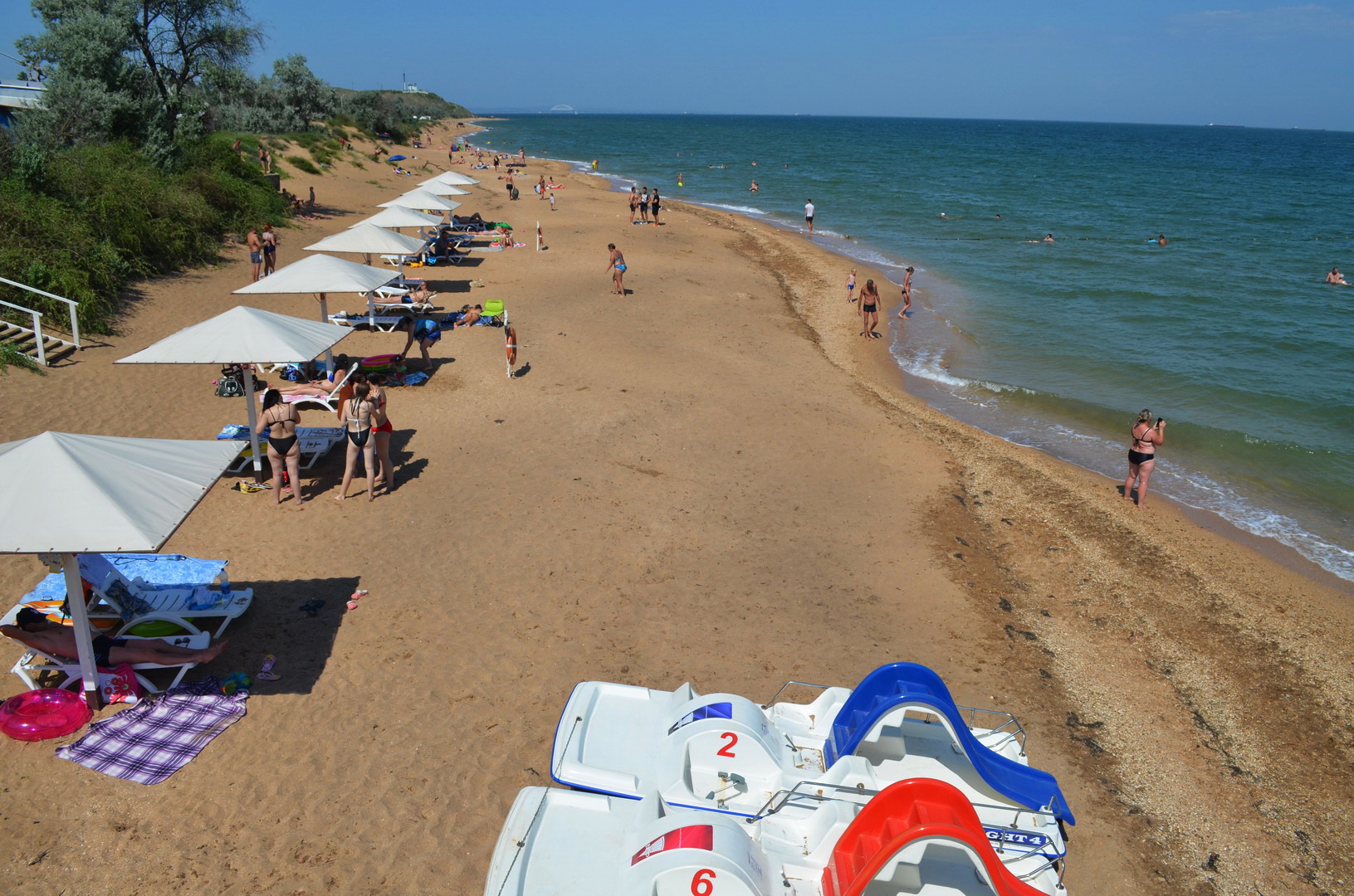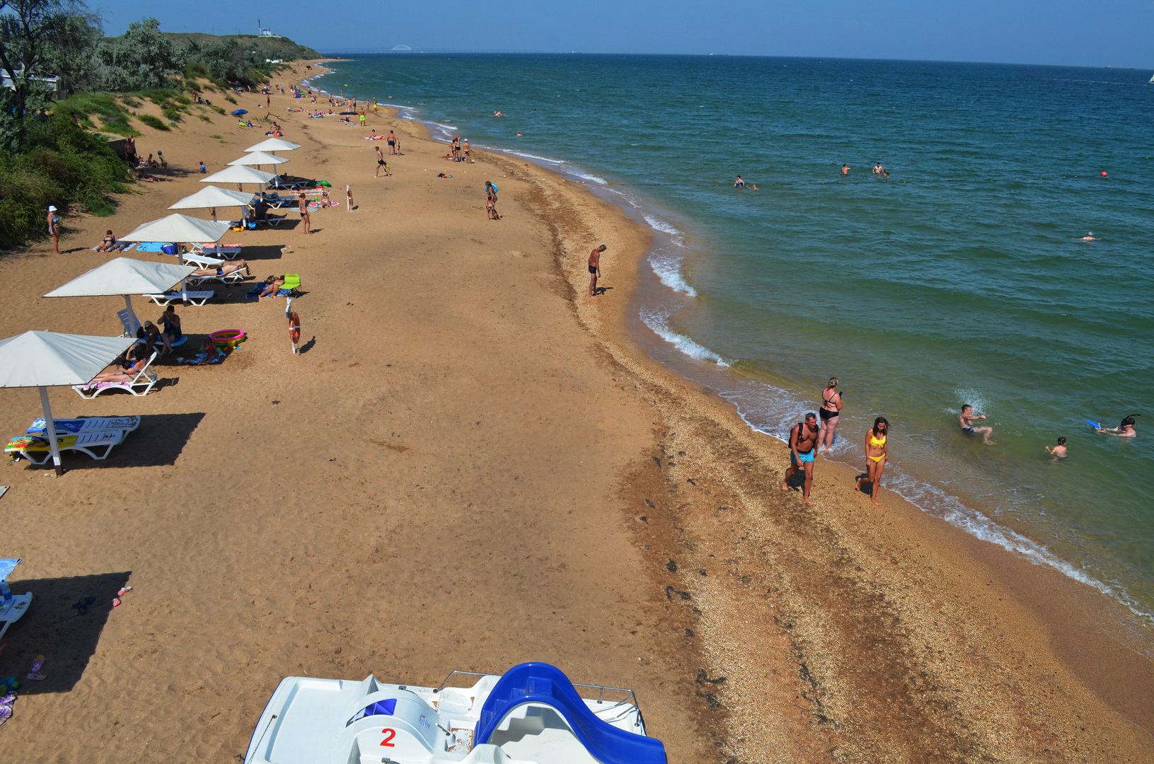 Теперь посмотрим в другую сторону, где многолюдно - насколько это вообще возможно на просторах самого лучшего пляжа в Крыму, но всё же есть какая-то "динамика" повышения плотности отдыхающих на пляже - здесь расположены пансионаты, отели, гостевые дома и мини-отели, вот, отдыхающие и идут, где ближе, а не где лучше. Мы уважаем их выбор, тем более, что те безлюдные просторы они оставляют нам, керчанам.