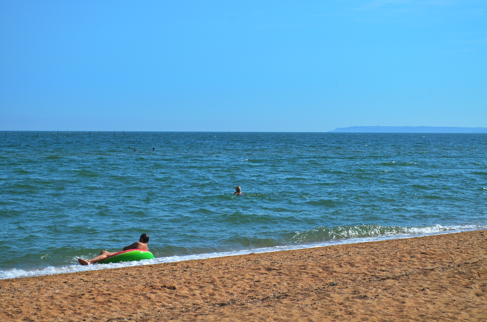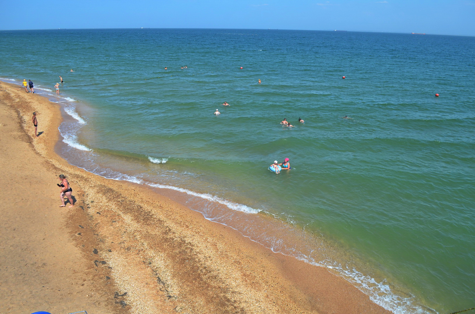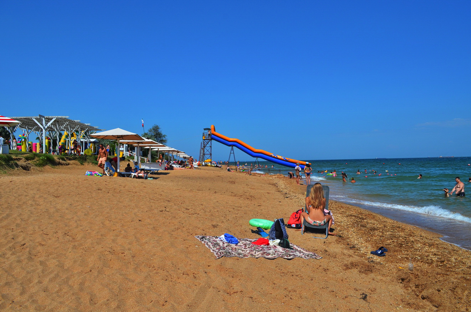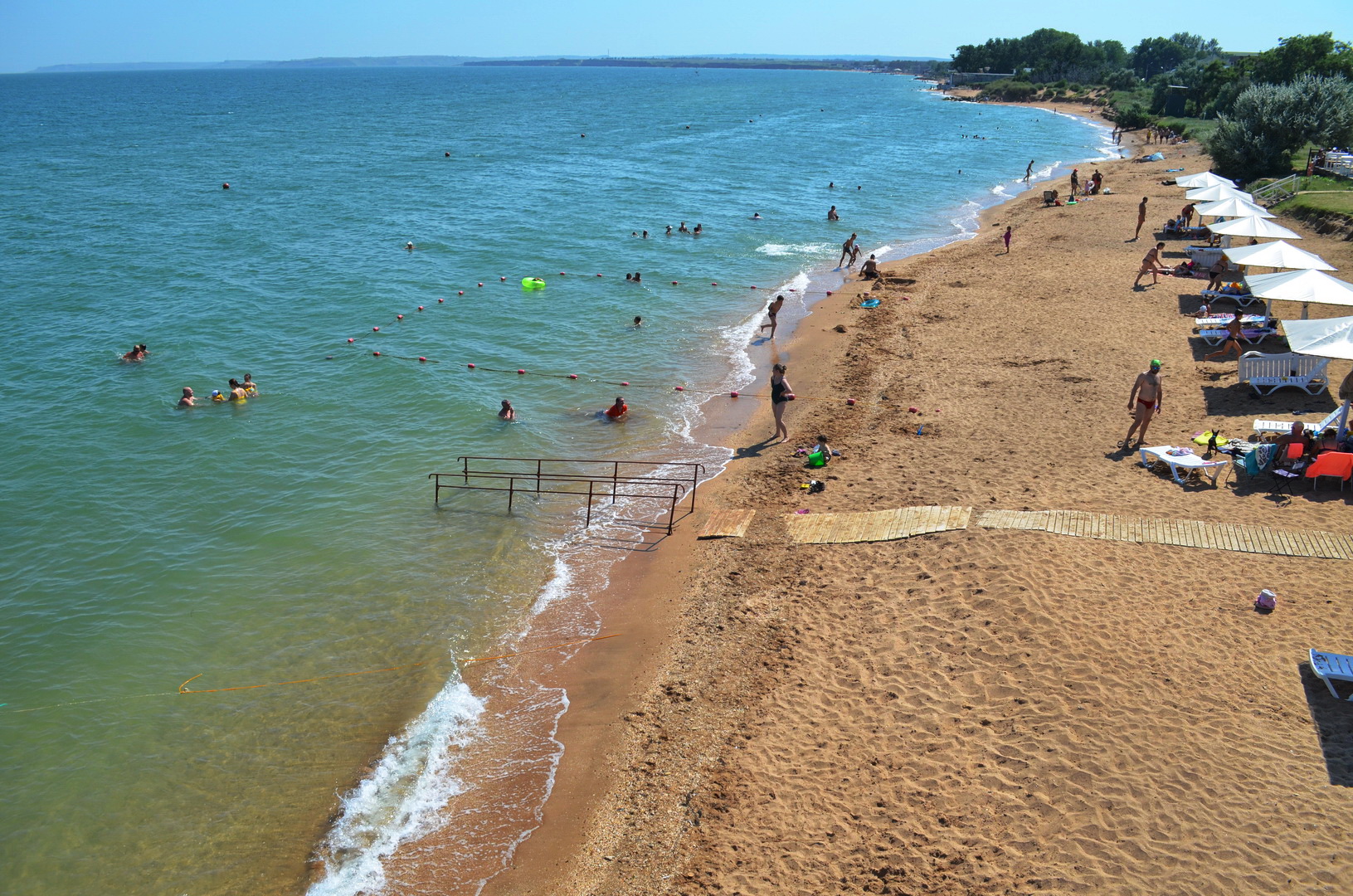 Теперь посмотрим в другую сторону, где многолюдно - насколько это вообще возможно на просторах самого лучшего пляжа в Крыму, но всё же есть какая-то "динамика" повышения плотности отдыхающих на пляже - здесь расположены пансионаты, отели, гостевые дома и мини-отели, вот, отдыхающие и идут, где ближе, а не где лучше. Мы уважаем их выбор, тем более, что те безлюдные просторы они оставляют нам, керчанам.