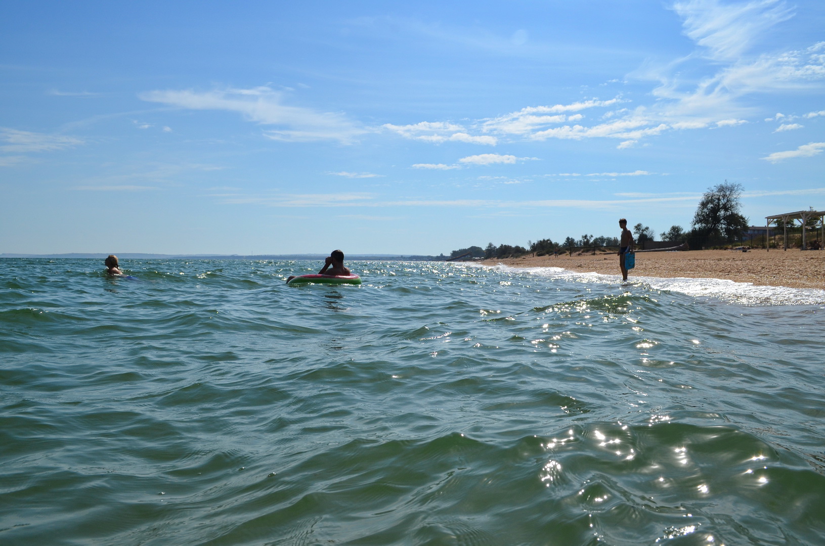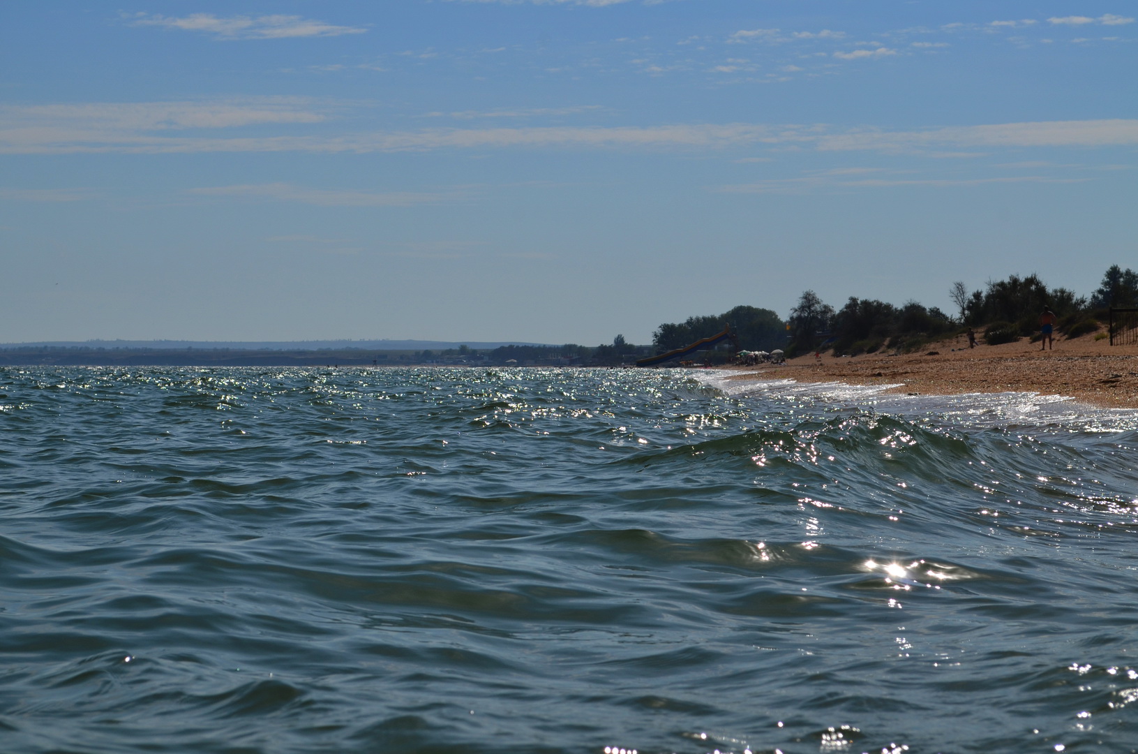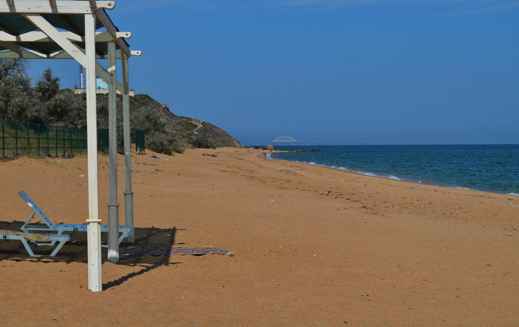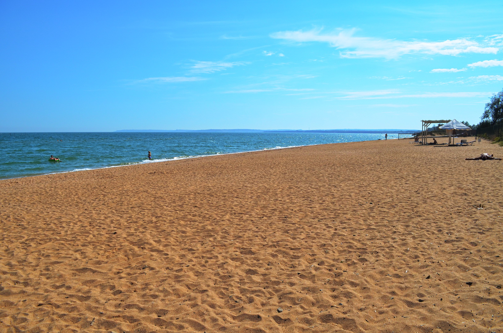 Теперь посмотрим в другую сторону, где многолюдно - насколько это вообще возможно на просторах самого лучшего пляжа в Крыму, но всё же есть какая-то "динамика" повышения плотности отдыхающих на пляже - здесь расположены пансионаты, отели, гостевые дома и мини-отели, вот, отдыхающие и идут, где ближе, а не где лучше. Мы уважаем их выбор, тем более, что те безлюдные просторы они оставляют нам, керчанам.