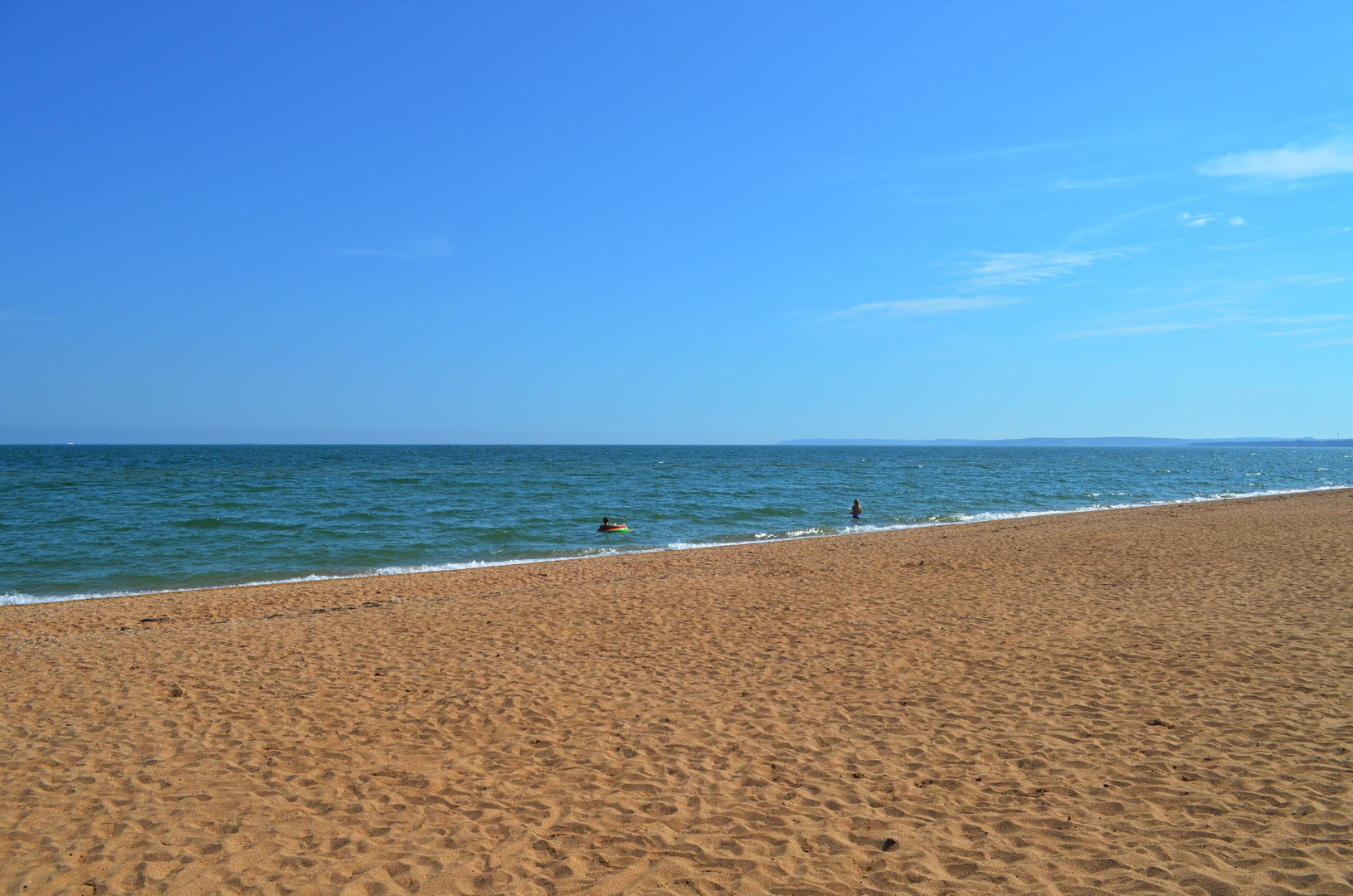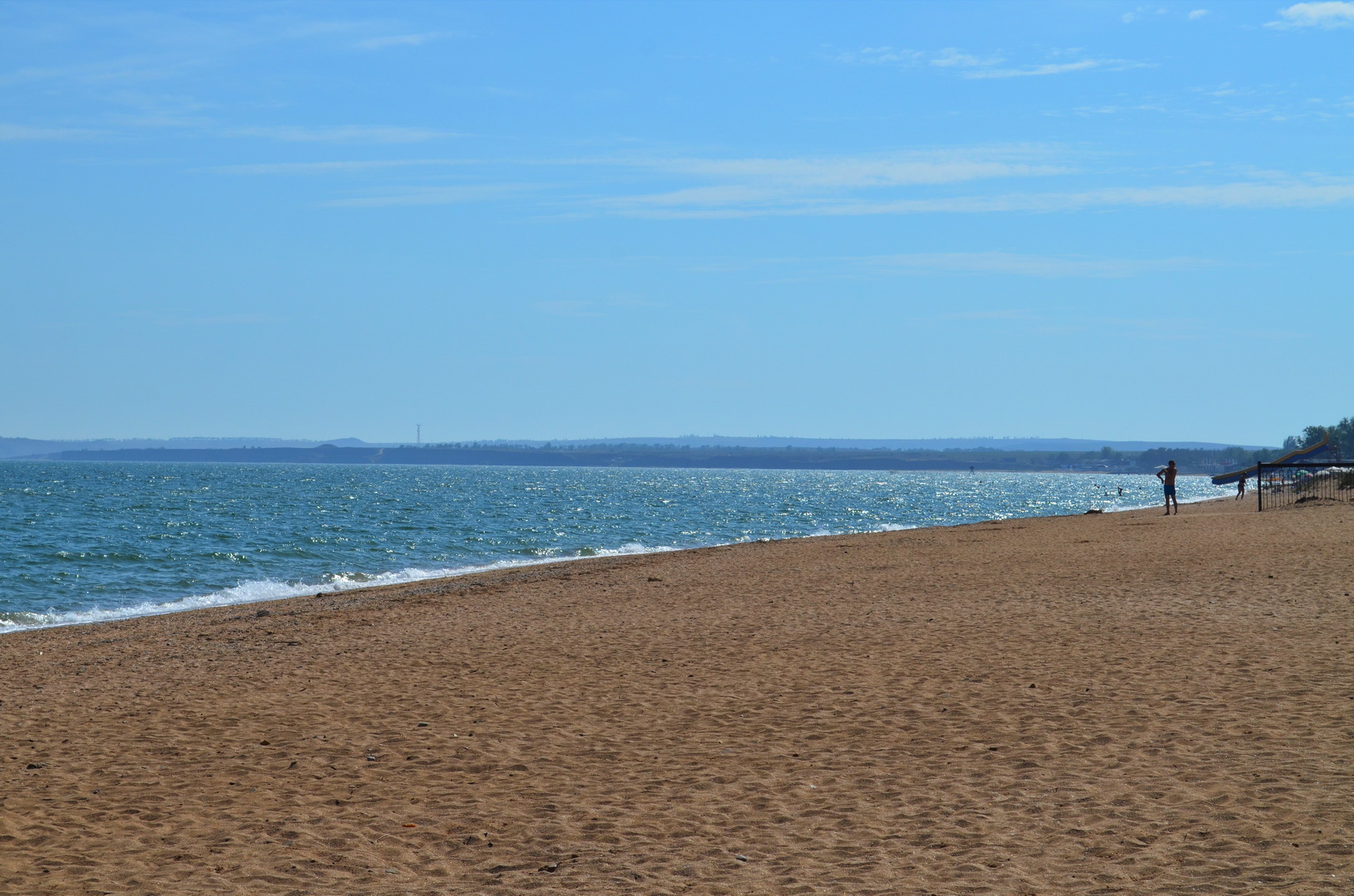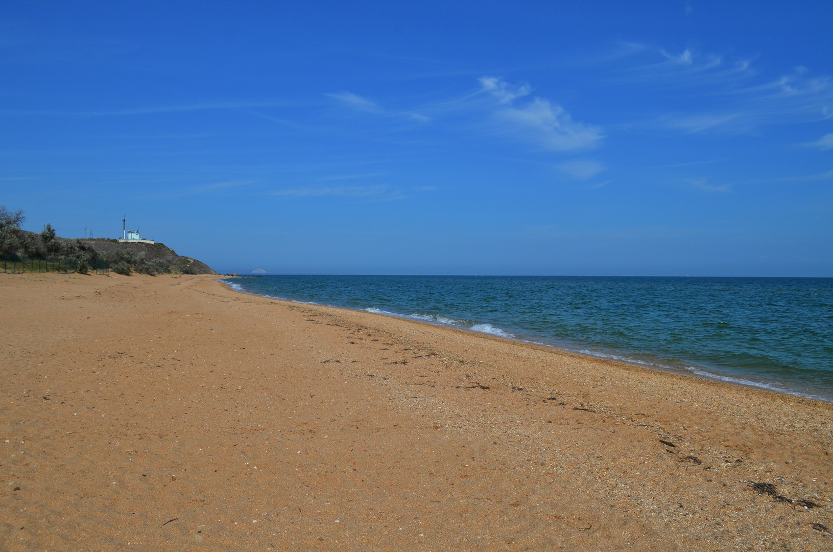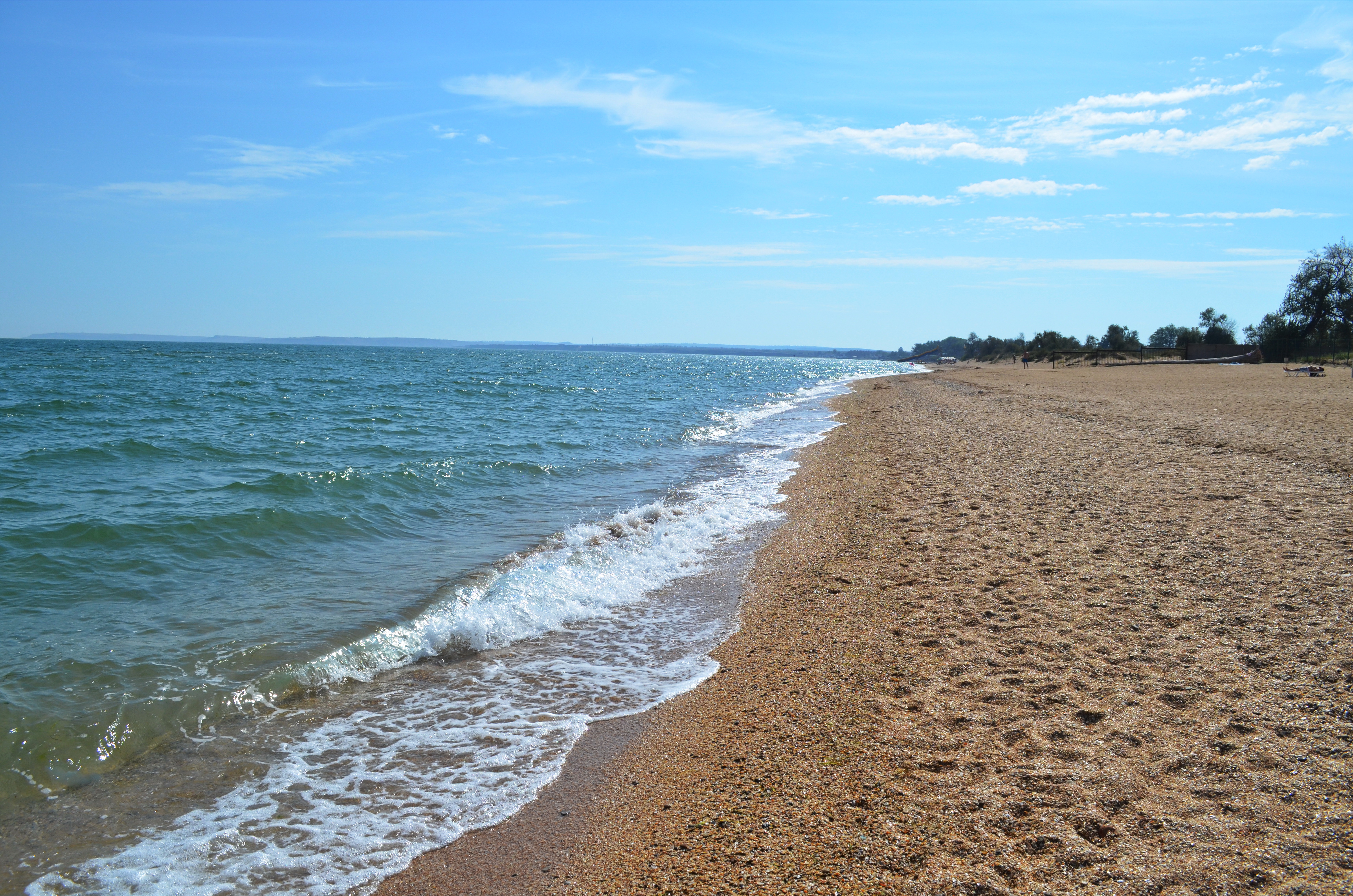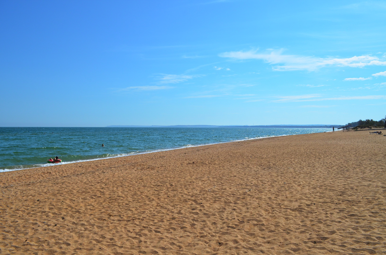 Теперь давайте повнимательнее рассмотрим безлюдный километровый участок лучшего пляжа в Крыму, расположенный слева от нас. Здесь останавливаются керчане, отдыхающие, желающие насладиться купанием уединенно и проходят отдыхающие, удовлетворяющие свои исследовательские потребности - а что там, за нашим пляжем под нашим отелем? А также здесь пробегают и отдыхающие, предпочитающие спортивный образ жизни: плывут в одну сторону, а потом возвращаются бегом по песку. Однако, достаточно слов, к делу! То есть, к фото: